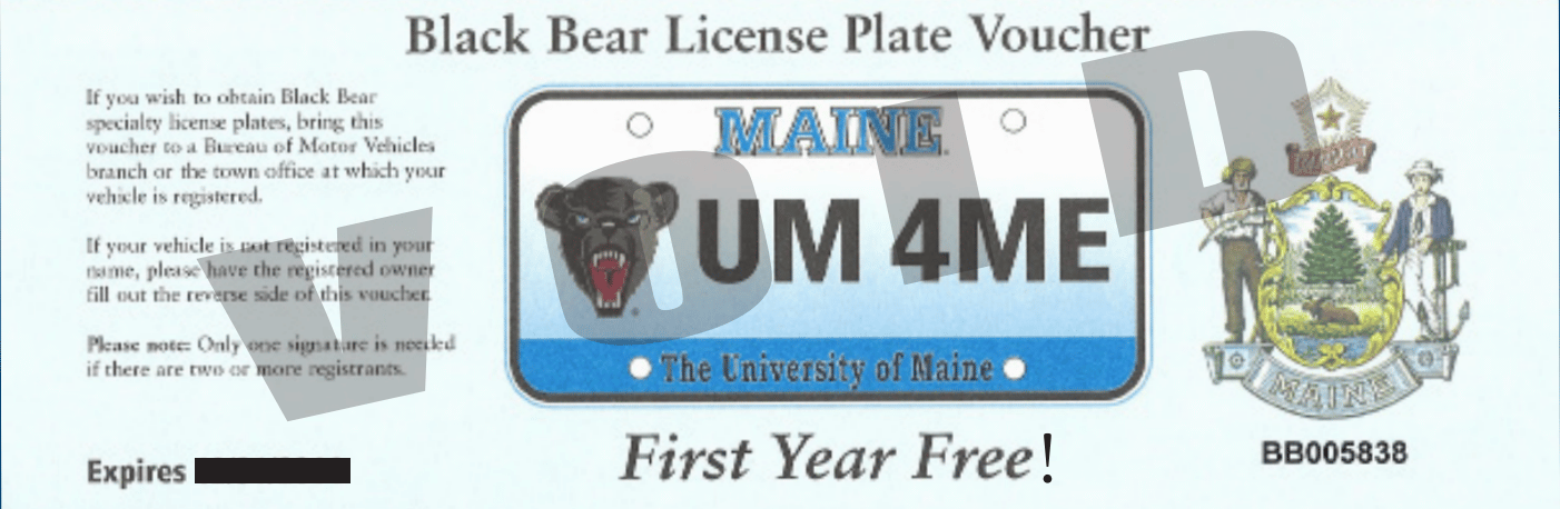 Anyone with state of Maine plates can use the voucher. Black Bear specialty plates are brought to you by the University of Maine Foundation, an independent nonprofit 501(c)(3) organization. Established in 1934, the foundation exists to encourage gifts and bequests to nurture academic achievement, foster research and elevate intellectual pursuit at the University of Maine. More information is available on the maine.gov website.